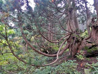 杉の生育には厳しい環境であることから成長が遅いため、樹齢が長く特異な形状をした杉の木が多い。