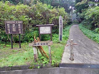「大佐渡石名天然杉」の遊歩道入口。 進行方向の道を塞ぐ「鎖」には、「立入禁止」とあり、 その左に、「遊歩道入口」の標柱が立つ。 |
