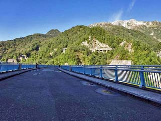 「黒部ダム」の堰堤(天端)。 トンネルを抜けると「黒部ダム」の右岸。 黒部ケーブルカーの「黒部湖駅」は、
