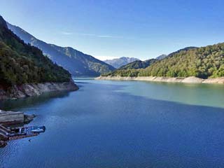 堰堤(天端)から見る「黒部ダム湖」。 |