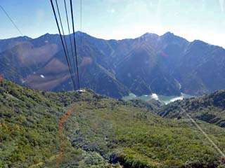 「立山ロープウェイ」のゴンドラから見る 「後立山連峰」と「黒部湖」。 ガラス越しに撮影のため、写真にはゴンドラの中が