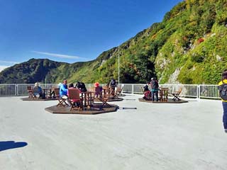 大観峰駅の「展望テラス」。 「展望テラス」は、「屋上展望台」の一段下で、 「立山トンネルトロリーバス」の発着所屋上である。 |