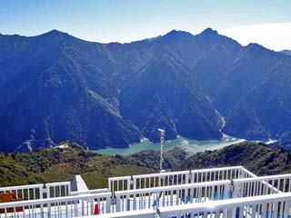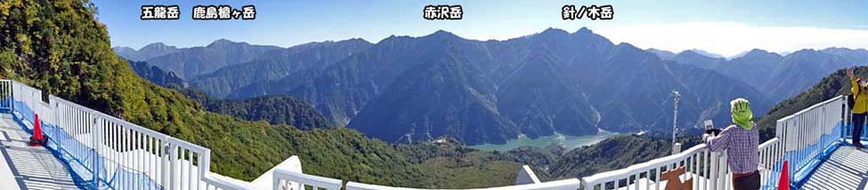 大観峰駅の「屋上展望台」から見る「後立山連峰」と「黒部湖」。