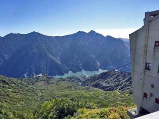 写真は、ダム展望台(建物屋上)から撮る 「黒部ダム」。 写真をクリックすると拡大写真(600x450)が 表示されます。 |