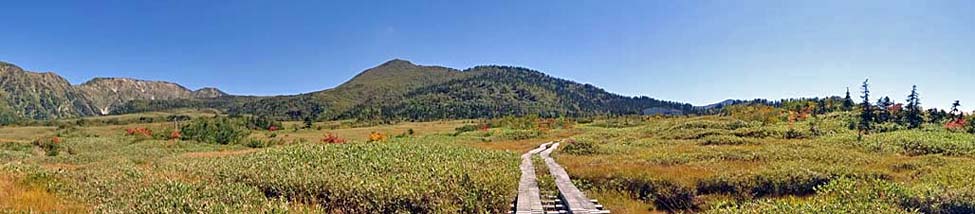 2022/9/29(10:40) 「弥陀ヶ原」の散策路から「富山市」の方向を撮る。 散策路(木道)の周囲には「池塘」が点在する。