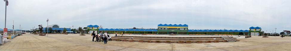 2014/10/31(11:58) 「イベント広場」。 手前に貝殻を彩った「シェルステージ」。奥に、「緑のパーゴラ」と呼ばれる、長さ180m、幅10mの回廊がある。 写真左に写る、かまぼこ形屋根の建物が「日本海交流センター」。 |