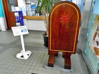 2014/10/31(12:02) 帆船「海王丸」の舷門。 「舷門(げんもん)」は、乗船者を迎えるために、 船の玄関口に立てる飾り板のことで、 「日本海交流センター」の入口を入ったところに 展示されていた。 |