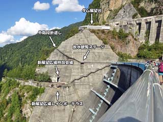 標高1,508mにある「ダム展望台」までを往復した記録を紹介する。 この「外階段」は、ダム右岸の岸壁に張り付くように造られている。 左の画像は、ダム左岸から撮る「外階段」の写真に、本HPで記述する名称と その場所を示す矢印を記述しています。 左の画像をクリックすると拡大画像(800x600)が表示されます。