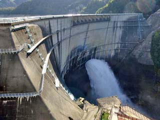 右の写真、放水観覧ステージからは、迫力ある放水の様子を見ることができるが、 「ダム湖」は、「堰堤(天端)」に隠れる。 右の写真をクリックすると拡大写真(600x450)が表示されます。 |