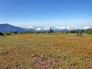 写真奥、木道右に「ガキの広場」。 地元では、「池塘」のことを「餓鬼(ガキ)の田」と 呼ぶそうで、「弥陀ヶ原」には、約3,000もの 小さな池や水たまりが点在する。 写真をクリックすると「ガキの広場」の 案内図(450x600)が表示されます。 |
