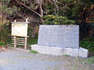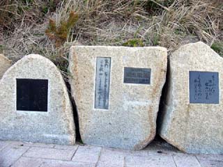 2010/3/27(6:50) 磯丸の歌碑。 「恋路ヶ浜」から「伊良湖岬灯台」に続く遊歩道 の縁石には、明和元年(1764年)、この地で 生まれ、漁夫歌人として知られる「糟谷磯丸」の 61首が刻まれている。 また、写真を撮っていないため紹介できないが、 灯台背後の斜面にある「万葉の歌碑」には、天武 朝の皇族麻績王が伊良湖に流された時に詠まれた 歌が刻まれている。 |