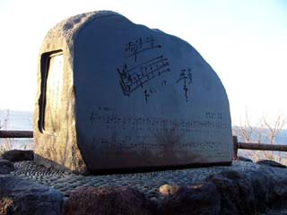 2010/3/27(6:17) 椰子の実記念碑(曲)。 国民歌謡「椰子の実」は、昭和11年、「島崎 藤村」の詩に「大中寅二」が作曲。NHKの国民 歌謡として全国に放送され、人々に愛される歌に なったとのこと。 |