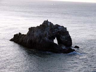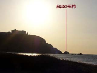 2010/3/27(6:37) 「恋路ヶ浜」から見る「日出の石門」。 「恋路ヶ浜」から見て、石門の穴から朝日が昇る 瞬間が見れる2月中旬と10月中旬。 それと元日は、カメラを持った写真家で、「恋路 ヶ浜」がいっぱいになるそうである。 |