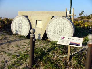 2010/3/27(6:38) 「日本の道百選」の碑。 「恋路ヶ浜」は、傍らを通るサイクリングロード が「日本の道百選」に選ばれている。 他にも。白い砂浜が「日本の渚百選」。松林の 続く風景が「日本の白砂青松百選」。潮騒の音が 「日本の音風景百選」に、それぞれ選ばれてい る。 |