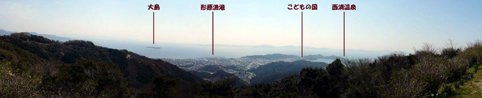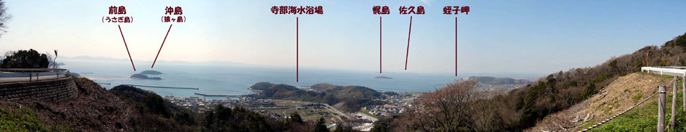 | 2010/3/27(10:15) 「見晴台」から見る「三河湾」。 後方に、うっすらと見えるのは「渥美半島」。 |