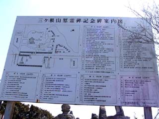 2010/3/27(10:20) 「三ヶ根観音」の境内には、数多くの慰霊碑/ 記念碑があり、上の案内図には85基が紹介され ている。特に、フィリピンの戦闘に参加した部隊 の慰霊碑は多く、毎年4月に「比島観音例大祭」 が行われているとのこと。 以下、慰霊碑/記念碑の一部を紹介する。 |