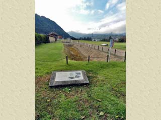 右の写真、駐車場の南側のフェンスには、「江馬氏館跡庭園 200m」の文字と、その方向を示す 矢印が書かれた横断幕が張られている。 左の写真をクリックすると現地に立つ案内板(500x650)が表示されます。 |