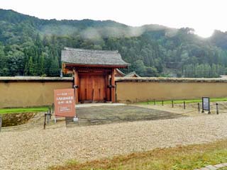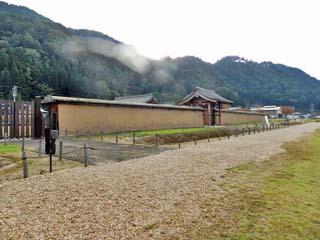 「西側土塀」。 高さ約3mの「土塀」中央に「主門」。 手前(北側)には、「脇門」がある。 |