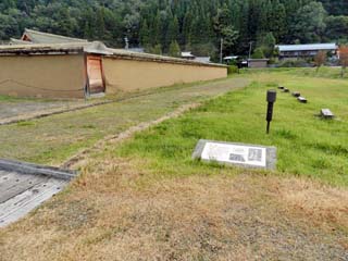 「南堀跡」。 ここ(土塀沿い)には、館の南側を区画し、 山麓の湧水を排水するための箱堀が 設けられていた。 |