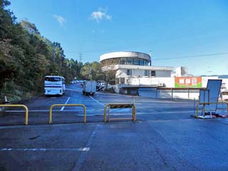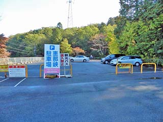 「恵那峡国際ホテル」と「恵那峡駐車場」。 2枚の写真は、同じ場所に立ち、前方と後方を撮影したものである。