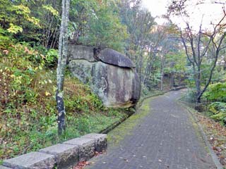 粗粒の「黒雲母」からなる丘陵が風化風蝕によって削られ、その一部がこの様な形で残ったとある。 左の写真をクリックすると「傘岩」の案内板(600x450)が表示されます。