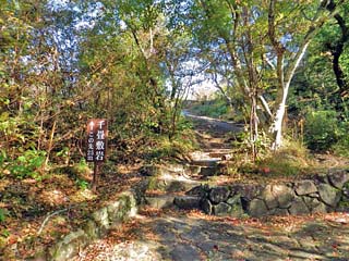 「千畳敷岩」に向かう。 入口を右に入ると、すぐに「千畳敷岩 この先25m」の 標識。この場所の右には「傘岩」も見えているのだが、