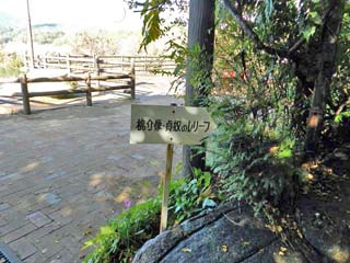 「桃介像・貞奴のレリーフ」の標識。 「桃介像・貞奴のレリーフ」は、「ダム湖」に突き出た