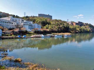 「恵那峡遊覧船」のりば。 「ダム湖」の両岸にそそりたつ「軍艦岩」や「獅子岩」、 「屏風岩」、「品の字岩」等の奇岩・怪石を30分で
