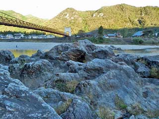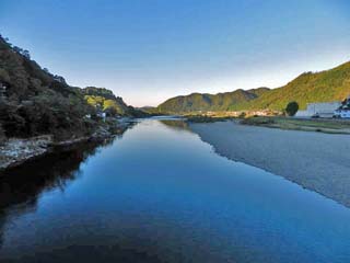 2015/10/26(6:46,6:47) 「美濃橋」と「お姫の井戸」の案内板。 道の駅「美濃にわか茶屋」から「長良川」の左岸に出ると、下流方向には「美濃橋」が見える。 左の写真は、下流方向に少し歩いた所で撮影。写真中央に写る岩の中に「お姫の井戸」がある。 右の写真、「お姫の井戸」の案内板には、この地方に伝わる伝説が書かれている。 昔、この辺りには龍神が住み、井戸にはその姫が住んでいて、井戸を汚すと龍神の怒りに触れ大洪水になると 言い伝えられていた。 ある年、大干ばつに見舞われ、雨乞いも効果がなく、村の庄屋「五兵衛」は、井戸を汚せば雨が降るのではと、 板とゴミを燃やし井戸を汚したところ、その翌朝から激しい雨が3日3晩降り続き、堤防は破壊され、家や田畑は 濁流に沈み、ついに「五兵衛」は、龍神の怒りを抑えようと、濁流に身を投げたところ、ようやく雨が止んだという。 それ以来、井戸には、しめ縄を張り、清浄に保ち、夏になると、しめ縄を新しく替え、龍神と「五兵衛」を祀る 「川祭り(現在は、花火大会)」が行われるようになったという。 左の写真をクリックすると拡大写真(600x450)が表示されます。 |