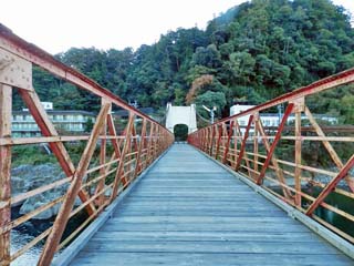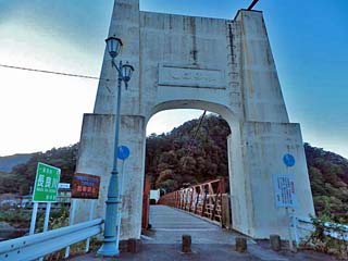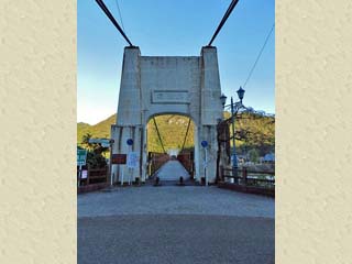 2015/10/26(6:50,6:50) 「長良川」の左岸で見る「美濃橋」。 「美濃橋」は、大正5年の竣工で、現存する日本最古の近代吊り橋と呼ばれ、 国の重要文化財に指定されている。 橋は、長さが113m、幅3.1m。歩行者と自転車専用の橋で、「老巧化して危険のため、 通行は、20人以下」との通行規制の看板が立つ。 右の写真をクリックすると拡大写真(450x600)が表示されます。 |