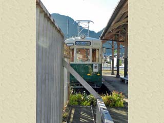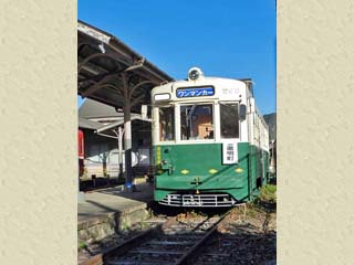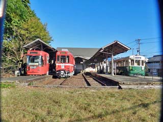 ホームの上に乗せてある。 写真をクリックすると「モ870形876号」と「モ600形601号」 の部分を切り抜く画像(450x600)が表示されます。 |