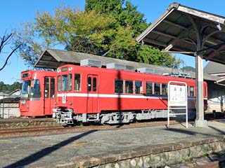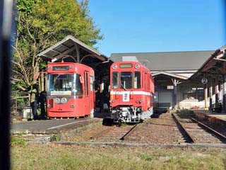 「モ870形876号(左)」と「モ600形601号(右)」。 「モ870形876号」は、カットボディーで、線路ではなく