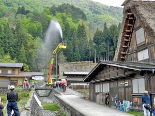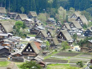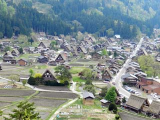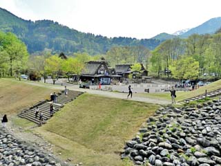 2012/5/7(13:19) 「白川郷 バス乗降所付近」。 近くには、大型車38台、普通車188台収容の 有料駐車場「せせらぎ公園駐車場」の他、 総合案内所「であいの館」等がある。 また、周辺には普通車数百台が収容できる臨時 駐車場も用意されている。