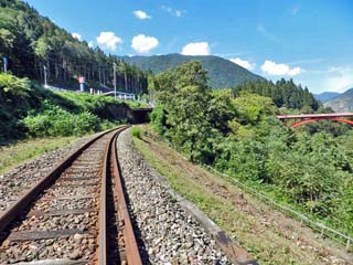 2019/9/26(12:08) 「木製トロッコ」。 「木製トロッコ」は、スタッフの乗る オートバイに押されて走行する。 この日第4便の発車時刻(12時)は 過ぎていたのだが、「木製トロッコ」なら、 今からでも間に合うとのこと。 午前中の「渓谷コース」の疲れが少し 残っていたのと料金も安く上がるため、 今回は、バイクをこがずに、景色だけを 楽しむことのできる「木製トロッコ」に 乗ることにした。 写真をクリックすると「木製トロッコ」部分を 切抜く画像(600x450)が表示されます。 |