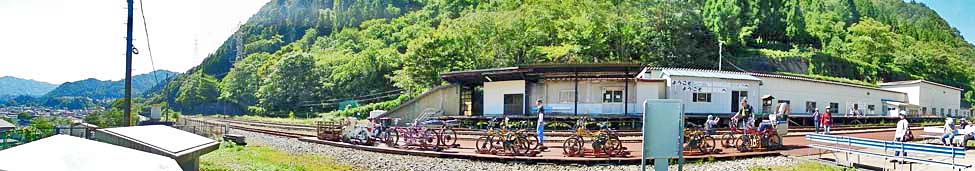 2019/9/26(12:26) 折り返し点「神岡鉱山前駅」に到着。 正面には、先に到着したマウンテンバイクが 向きを変えるためレールの上から外され、 線路の左側に、4人乗り「タンデム車」と 2人乗りの「ハイブリッド車」が置かれる。 線路の奥には、「2階建てシートセット」がある。 写真をクリックすると先に到着したバイクを 切抜く画像(600x450)が表示されます。 |