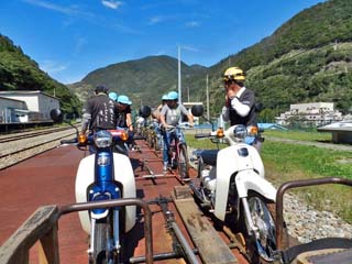 2019/9/26(12:14) 「木製トロッコ」がオートバイに押されスタート。 「まちなかコース」は、片道約2.9km。 高低差30m。往きが下り、帰りは上りで、 途中に、トンネルが2つ、高架橋が1つある。 往復約5.8kmで、所要時間約40~50分。 事前説明(レクチャー)を含めた総所要時間は 1時間程である。 |