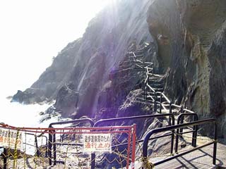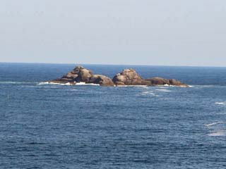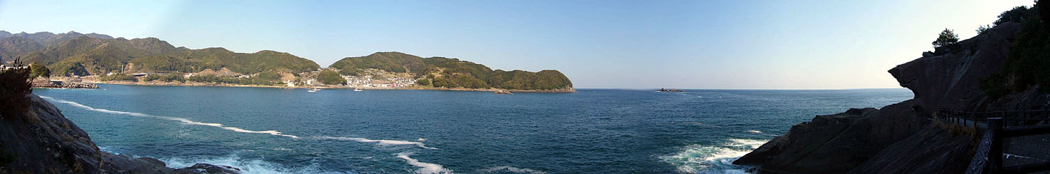 2011/4/5(15:35) 南東の方向には「魔見ヶ島」が浮かぶ。 この島は、釣り人に人気が高く、「イシダイ」、 「ヒラマサ」、「ハマチ」等あらゆる釣り物が そろう上に、大物が釣れることで知られる。 (注)望遠で撮影。実際には、15時42分の パノラマ写真と同じくらいに小さく見えます。