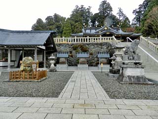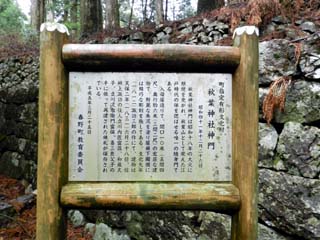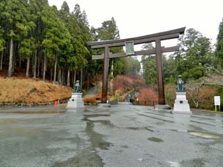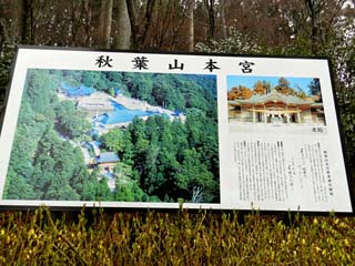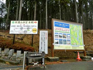 2012/4/14(9:45,9:46) 「秋葉神社上社」第一駐車場にある「大鳥居」と案内板。 「秋葉神社」の正式名称は、「秋葉山本宮秋葉神社」。全国にある「秋葉神社」の総本宮であり、 「火の幸を恵み、悪火を鎮め、火を司り給ふ神様」として全国に知られる。 場所は、南アルプス赤石山脈の最南端天竜川の上流に位置する標高866mの「秋葉山」にあるが、 2012年7月現在の公式HPでは、「遠州鉄道西鹿島線の終点西鹿島駅にて下車、 これより先はタクシー(片道約7000円)しかございません」とある。 なんとも、人里離れた場所にあるが、「秋葉神社上社」の周辺には3つの駐車場が用意され、 普通車300台以上が止められるという。 なお、「秋葉山本宮秋葉神社」は、「秋葉山」の麓に鎮座する「下社」と、山頂に鎮座する 「上社」とに分かれるが、本ページでは山頂の「上社」を紹介する。