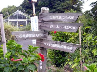| 2009/9/12(8:19) 「石廊崎港」「石廊崎灯台」共に0.5kmと あり、「石廊崎灯台」までの中間地点 後ろに見える温室は、廃園になった「石廊崎 ジャングルパーク」の建物 |