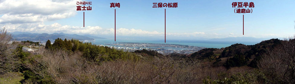 | 2010/3/26(10:46) 東展望台からの景色。 あいにく「富士山」は雲に隠れているが、眼下には「三保半島」「駿河湾」。「駿河湾」の先には「伊豆半島」が見えている。 なお、「達磨山」は、「戸田」と「修善寺」の間にある「戸田峠」の2km程南にある。 |