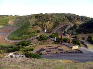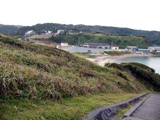 2009/9/11(17:07) 「爪木崎公園」東側から海岸に降りる途中で、 「駐車場」方面を見た景色 |