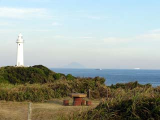2009/9/11(16:51) 「爪木崎公園」の丘の上から見る「爪木崎灯台」 真中にうっすらと写っているのは「利島」 |