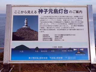 | 2009/9/11(17:01) 「神子元島灯台」の説明 「爪木崎の南10km沖合いにあり、日本最古の 洋式石造り灯台である」と書かれている |