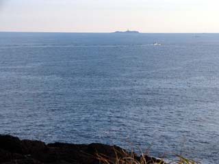 2009/9/11(17:03) 爪木崎の南10km沖合いに浮かぶ「神子元島」 島の中央付近に尖って見えるのが「神子元島 灯台」であろう |