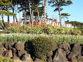 | 2009/12/21(8:21) 公園入口近くの花壇に植えられた「アロエ」と 「水仙」の花。 |