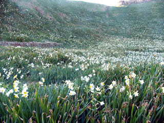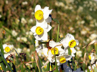 2009/12/21(8:44) 公園海側の斜面に咲く「水仙」の群落。 この日は、「水仙まつり」が始まって、2日目。 花の最盛期は、まだまだこれからと思われるのに この花の多さには驚きである。 参考:下田市観光協会のHPでは、2010年 1月4日時点の情報として、「9分【見頃】: 全体的に見頃を迎え、遠目から見下ろすと白い ジュータンが敷き詰められている様」とあった。 |