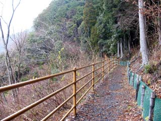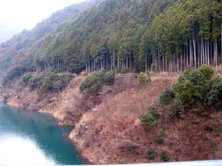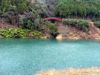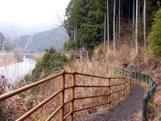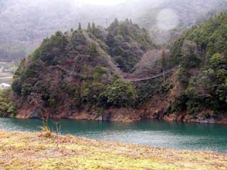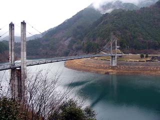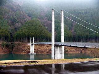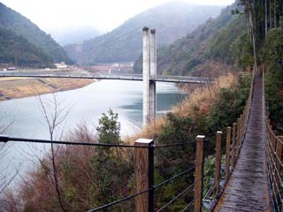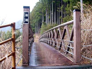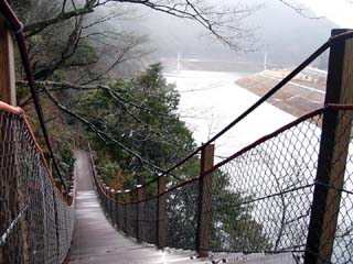 2010/12/24(10:12) 「南アルプス接岨大吊橋」の上から右側に見える 「欅橋」。 この日、天気が崩れる等という予報は全くなく、 途中の「島田市」周辺では、行き帰り共に晴れて いたのだが、「接岨峡」の周辺では、小雪混じり の冷たい雨となってしまった。