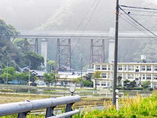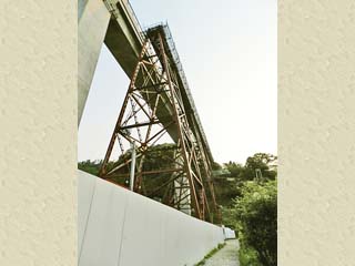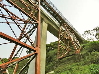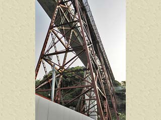 2012/5/9(17:39) 南側から6.5倍ズームで撮る「餘部橋梁」。 トレッスル式の旧橋は、「餘部駅」寄り3本の 橋脚・桁等が残されている。