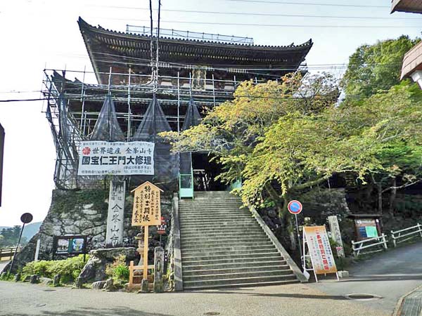 2019/4/23(7:45) 金峯山寺「仁王門」。 国軸山「金峯山(きんぷせん)寺」は、桜の名所として知られる「吉野山」にある 「金峯山修験本宗(修験道)」の総本山である。 延元3年(1338)頃の南北朝時代の再建とされ、約70年ぶりの大修理中の 「仁王門」は、重層入母屋造の2階建。大きさは、高さ20m、幅12m。 門の左右には、日本で二番目の大きさを誇る、高さ5.1mの桧材寄木造りの 金剛力士(仁王)像が安置され、本堂「蔵王堂」と共に、国宝に指定されている。 なお、「金峯山寺」には、専用駐車場がない。また、周辺の道路は狭く駐車禁止。 観桜時期の昼間は、歩行者天国となり、進入すらできない。 このため、車では、「下千本地区」にある観光駐車場から徒歩15分(1km)程を 歩くことになるが、週末等は、観光駐車場までも入れず、指定の郊外駐車場から 観光駐車場まで、無料のシャトルバスを利用することになる。 |