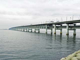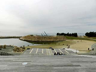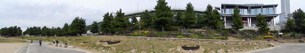 2012/3/22(14:12) 「太鼓橋」の上から見る「りんくう公園」。 「太鼓橋」の下に「石舞台」。 「石舞台」の先、円形に広がるのが、24個の 石を環状に並べた「環状石」。 更に奥の一段高い部分が「四季の泉」である。